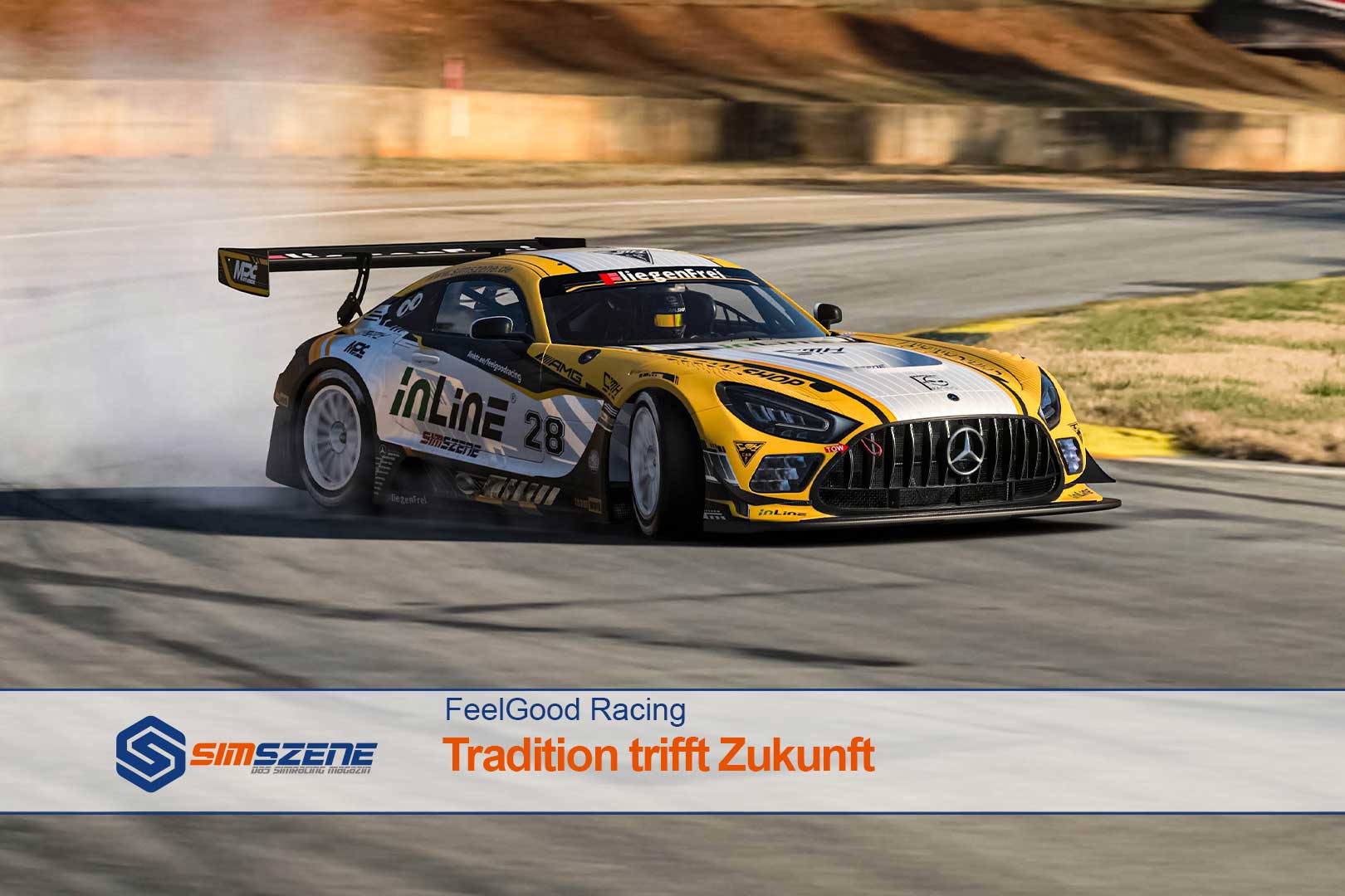 Eine zentrale Rolle übernimmt das leuchtende Gelb, das sich auffällig um die markanten Kotflügel legt und die Konturen der Rennboliden betont. Dort prangt zudem in imposanten Lettern der Sponsor Schriftzug „inLine“, dessen Intensität sich von schlichten, dennoch eleganten Weiß- und Schwarztönen abhebt. Auf der Motorhaube fasziniert ein klar strukturiertes Farbschema, das den Blick des Betrachters augenblicklich fesselt.