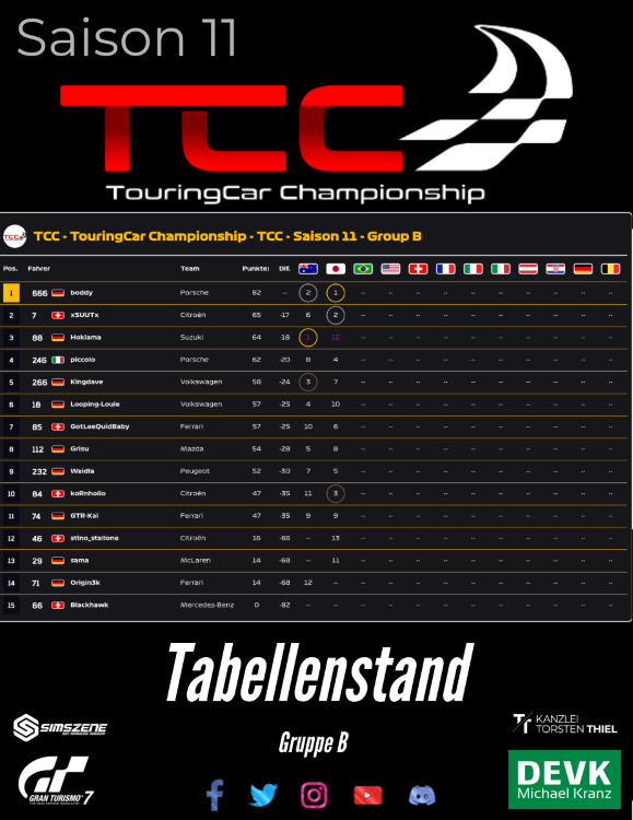 boddy (Porsche) baut seine Führung mit nunmehr 82 Punkten aus. xSUUTx (Citroën) (75 Pkt.) und Hokiama (Suzuki) (74 Pkt.) folgen dicht. Der Doppelerfolg von Citroën verschärft den Kampf in der Verfolgergruppe.