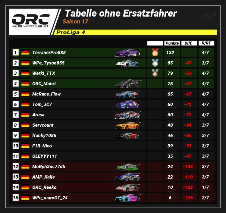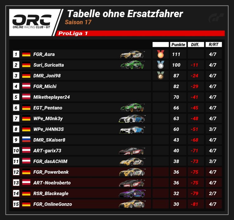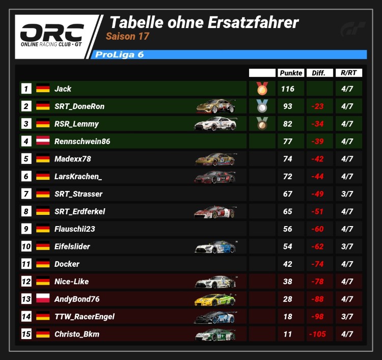Nach vier Rennen der Saison 17 führt Jack (116 Pkt.) die Tabelle der ProLiga 6 an. Auf dem zweiten Rang folgt SRT_DoneRon (93 Pkt.) mit 23 Punkten Rückstand. RSR_Lemmy (82 Pkt.) komplettiert das Podium auf P3 (34 Pkt. Differenz).
