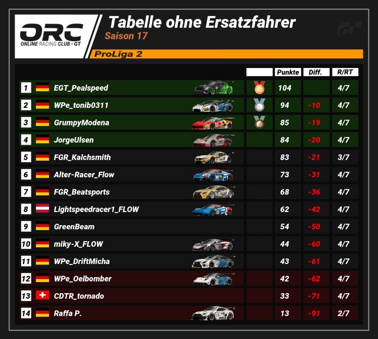 In der ProLiga 2 hat sich EGT_Pealspeed (104 Pkt.) ein Polster von 10 Punkten auf Verfolger WPe_tonib0311 (94 Pkt.) erarbeitet. GrumpyModena (85 Pkt.) belegt den dritten Platz, liegt aber bereits 19 Zähler hinter dem Führenden.