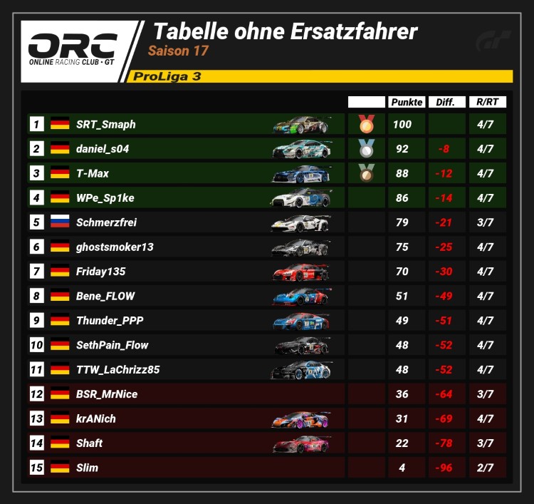 Hochspannung in der ProLiga 3! SRT_Smaph (100 Pkt.) führt, doch die Konkurrenz sitzt ihm im Nacken. daniel_s04 (92 Pkt.) ist mit nur 8 Punkten Differenz auf P2. T-Max (88 Pkt., -12 Diff.) auf P3 lauert ebenfalls noch in Schlagdistanz.