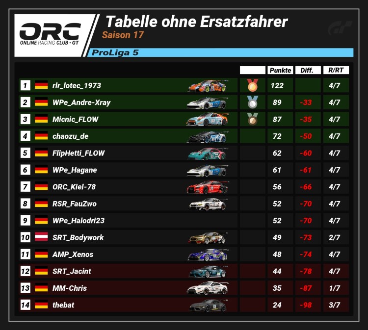 rlr_lotec_1973 (122 Pkt.) hat die Führung in der ProLiga 5 fest im Griff (33 Pkt. Vorsprung). Dahinter tobt jedoch ein Zweikampf um P2: WPe_Andre-Xray (89 Pkt.) wird dicht von Micnic_FLOW (87 Pkt.) verfolgt, den nur zwei Zähler trennen.