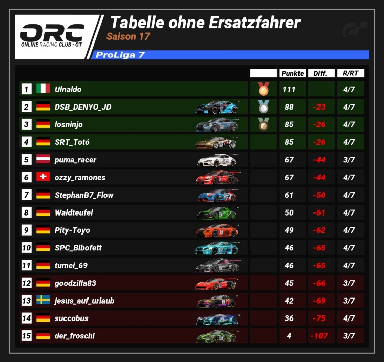An der Spitze der ProLiga 7 steht Ulnaldo mit 111 Punkten. Der Kampf um P2 ist jedoch offen: DSB_DENYO_JD (88 Pkt.) hat 23 Punkte Rückstand, wird aber von losninjo (85 Pkt.) bedrängt, der nur 3 Zähler hinter P2 liegt.