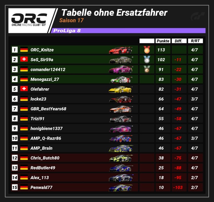 In der ProLiga 8 konnte ORC_Knitze (113 Pkt.) seine Führung auf 11 Punkte ausbauen. Verfolger SeS_Sir59a (102 Pkt.) hält P2. Auf dem dritten Platz rangiert comander124412 (91 Pkt.), der 22 Zähler Rückstand auf die Tabellenspitze aufweist.