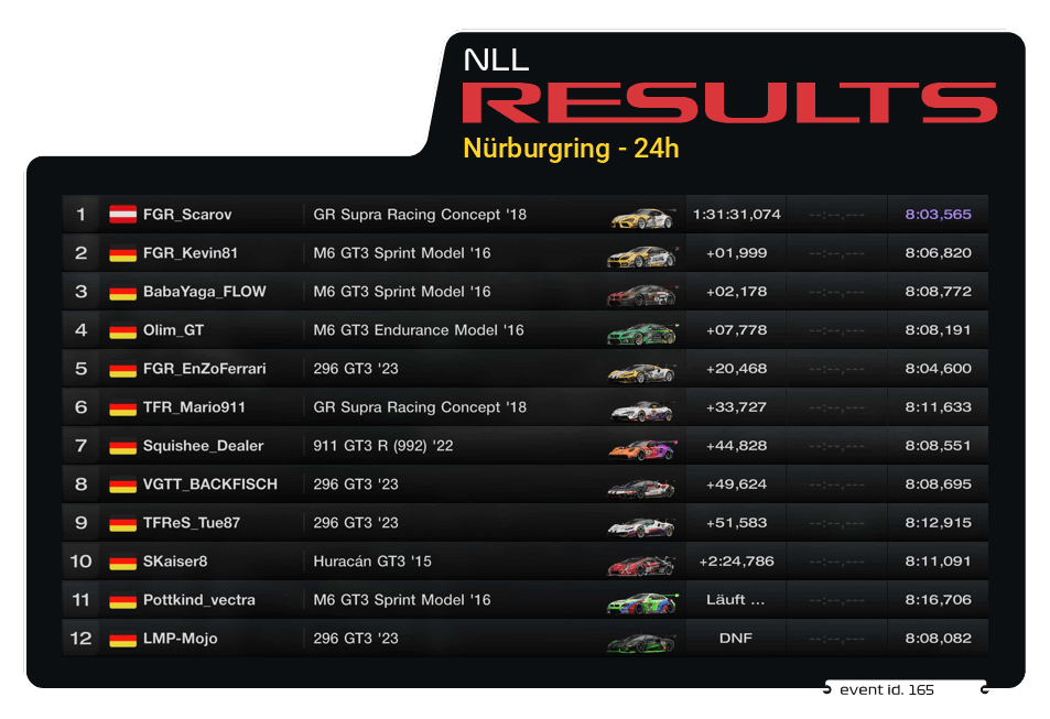Die 24h-Variante des Nürburgrings ist der ultimative Härtetest. Sie verbindet auf 25,378 Kilometern den modernen Grand-Prix-Kurs mit der historischen Nordschleife. Über 170 Kurven, gewaltige Höhenunterschiede und der gnadenlose Übergang in die tiefe Nacht verlangen den Fahrern bei hohen Geschwindigkeiten alles ab. Schon vor dem Rennstart sorgte das Reglement für rauchende Köpfe: Die Reifenmischungen „Hart“ und „Weich“ wurden als Pflichtreifen verlost. Dies ließ kaum taktischen Spielraum und erzwang spannende Duelle auf der Strecke. Denkbar schlecht lief es für den bisherigen Dominator und Tabellenführer Squishee_Dealer. Bereits in der Anfangsphase verlor er unter Druck auf dem GP-Kurs die Kontrolle über seinen Porsche, stand quer und kollidierte unglücklich mit FGR_Kevin81. Während Squishee_Dealer weit zurückfiel und am Ende nur Platz 7 ins Ziel rettete, musste Kevin fortan mit einem massiven Frontschaden an seinem BMW M6 kämpfen.