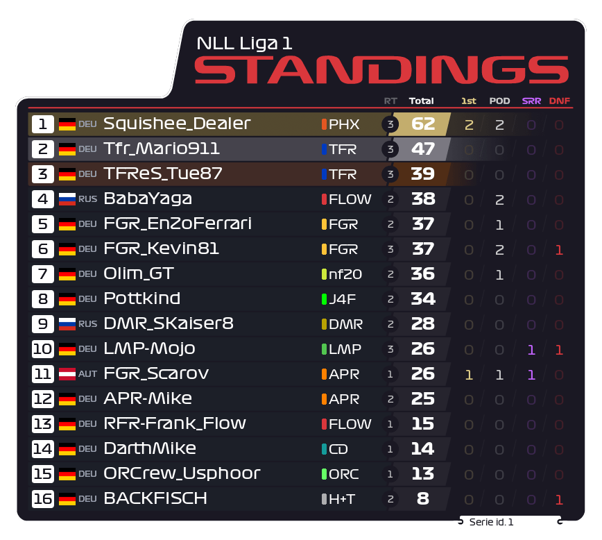 Trotz des gebrauchten Tages behält Squishee_Dealer (62 Punkte) die Führung in der Gesamtwertung, doch die Konkurrenz um TFR_Mario911 (47 Punkte) rückt näher. Mit dem furiosen Sieg von FGR_Scarov ist zudem bewiesen: Wenn das Alien Blut leckt, ist kein Vorsprung sicher. Das nächste Kapitel dieser hochklassigen Liga wird am 31.03.2026 auf dem klassischen Nordschleifen-Layout geschrieben.